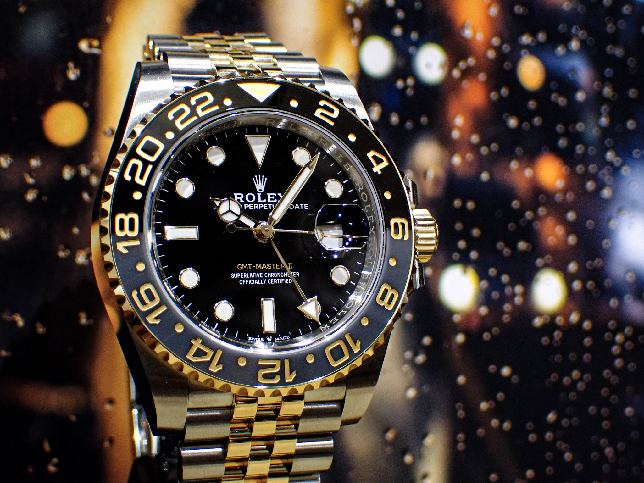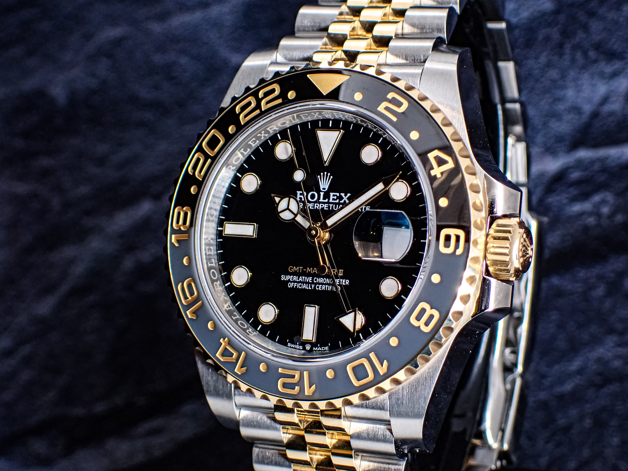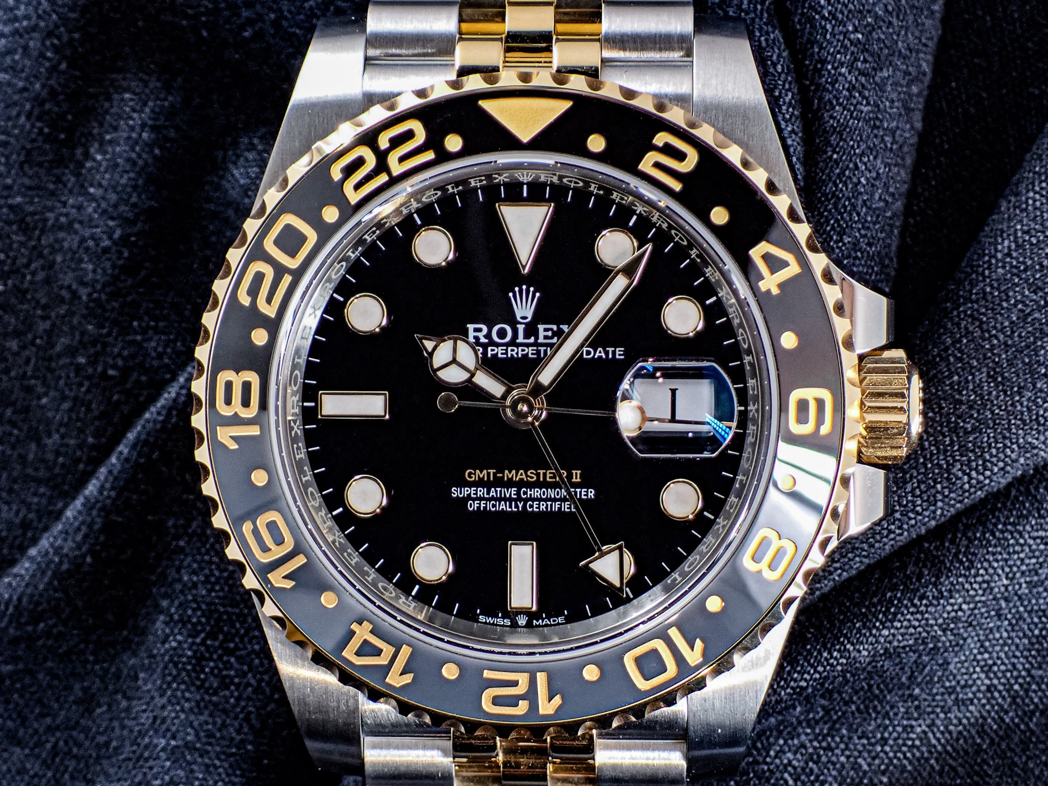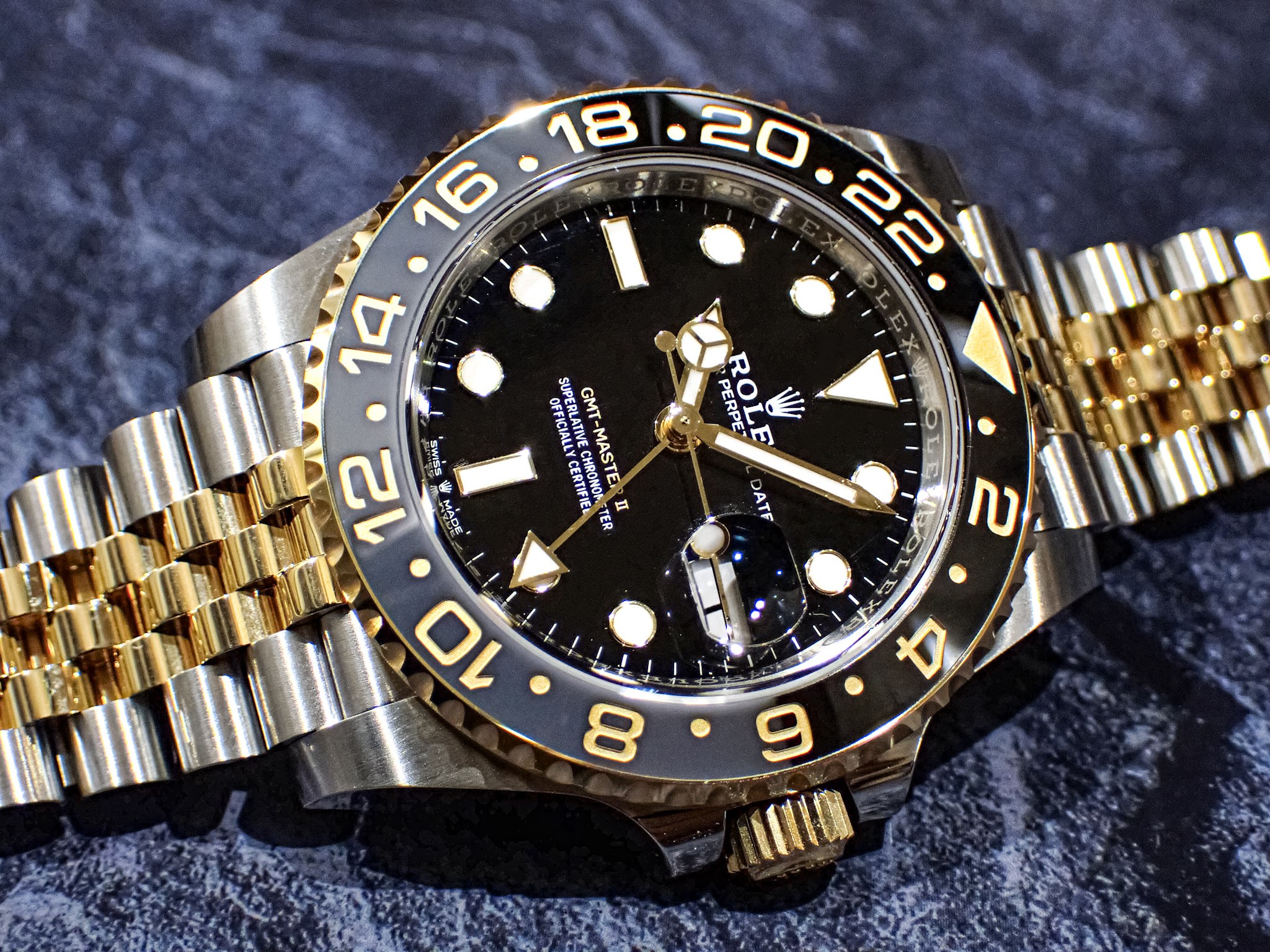 一世代前の「116713LN」では24時間針とGMTマスターの文字がグリーンだったのに対して、現行のこちらは全ての針とGMTマスターの文字がイエローゴールドに変更されダイヤル内部の統一感が増しております!