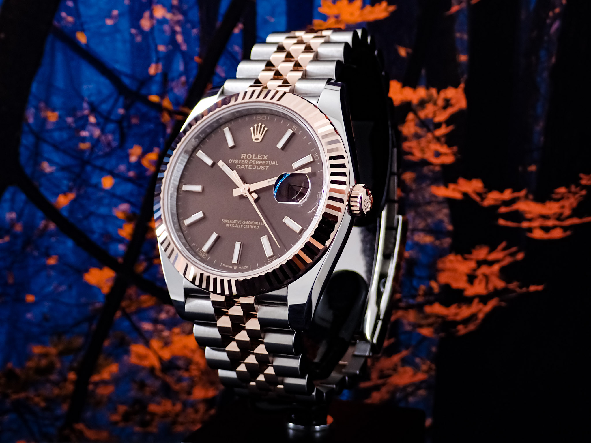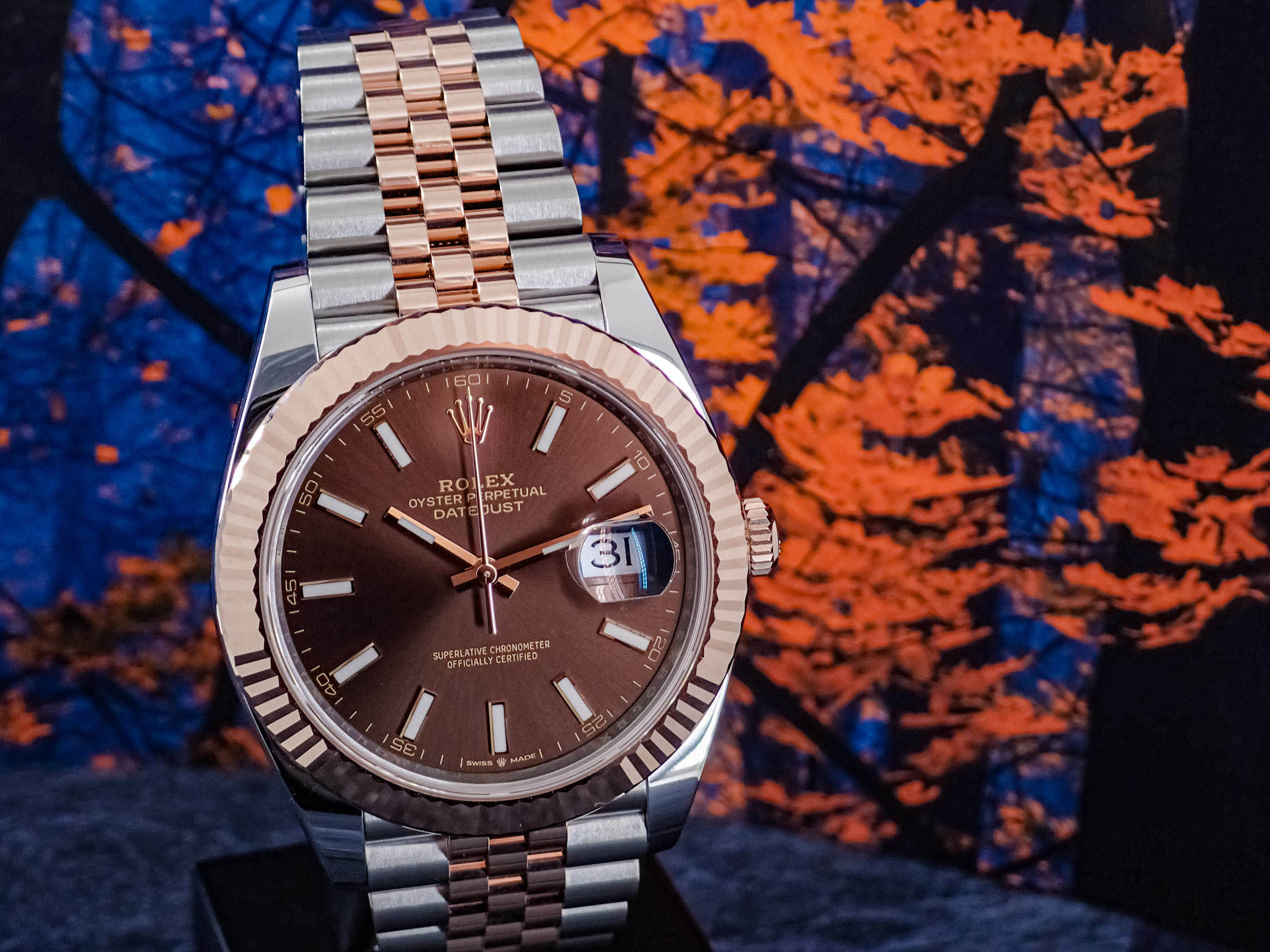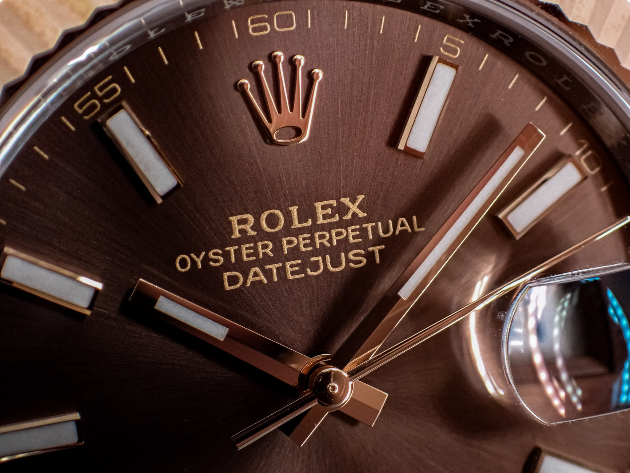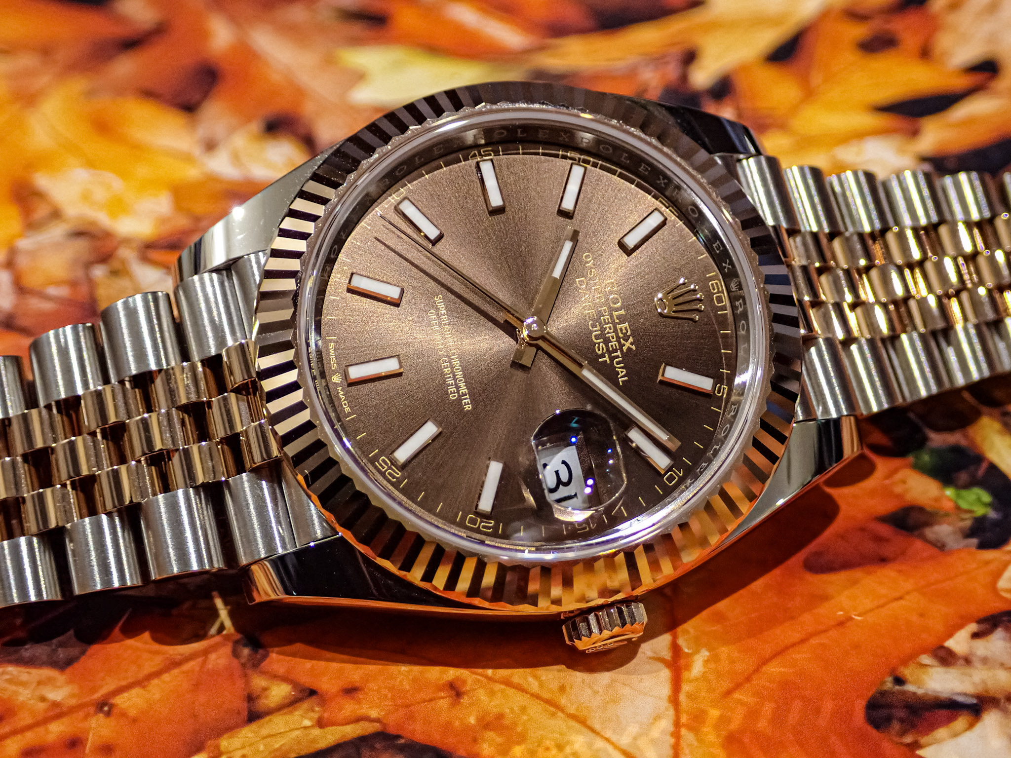 かわいいチョコレート色のダイヤルのこのRef.126331ですが、フルーテッドベゼルとジュビリーブレスの組み合わせですので上品且つ煌びやかな仕上がりです。