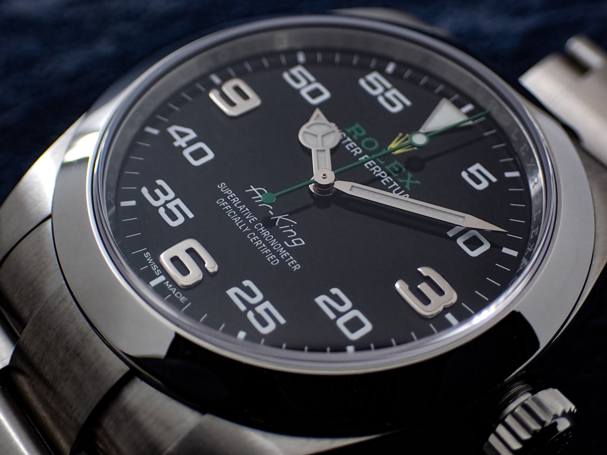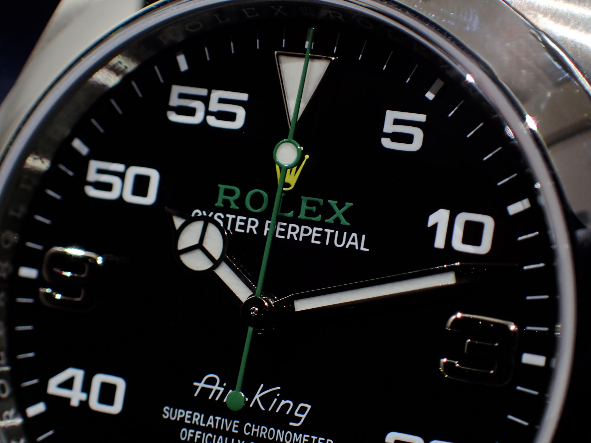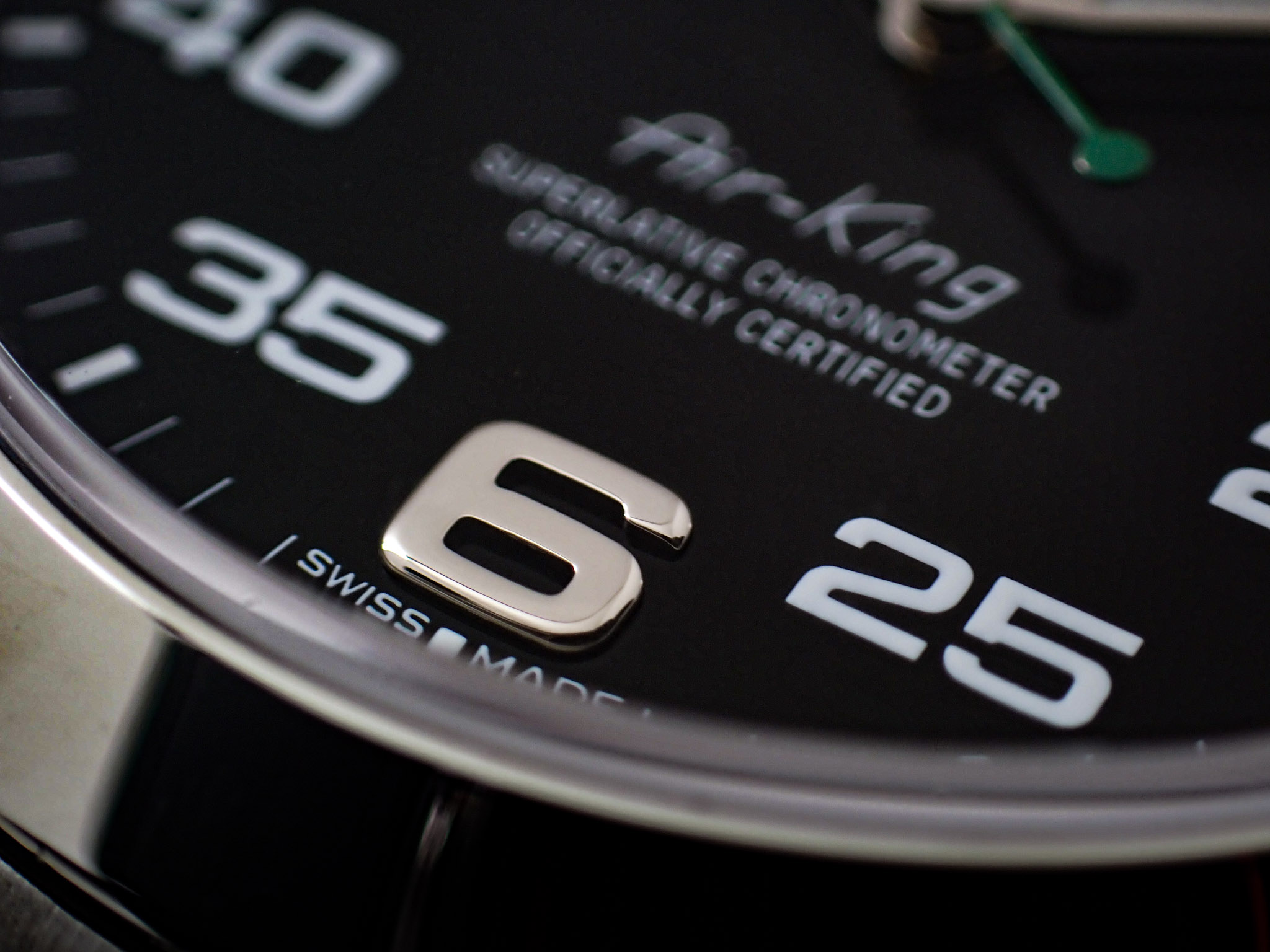 地上最速を目指す超音速カー、「ブラッドハウンドSSC」のコックピット計器を彷彿とさせるダイヤルには、1950年代当時と同じ「Air-King」の刻印と、イエローカラーのクラウンマークと、コーポレートカラーのグリーンのベゼルと秒針が個性的です!