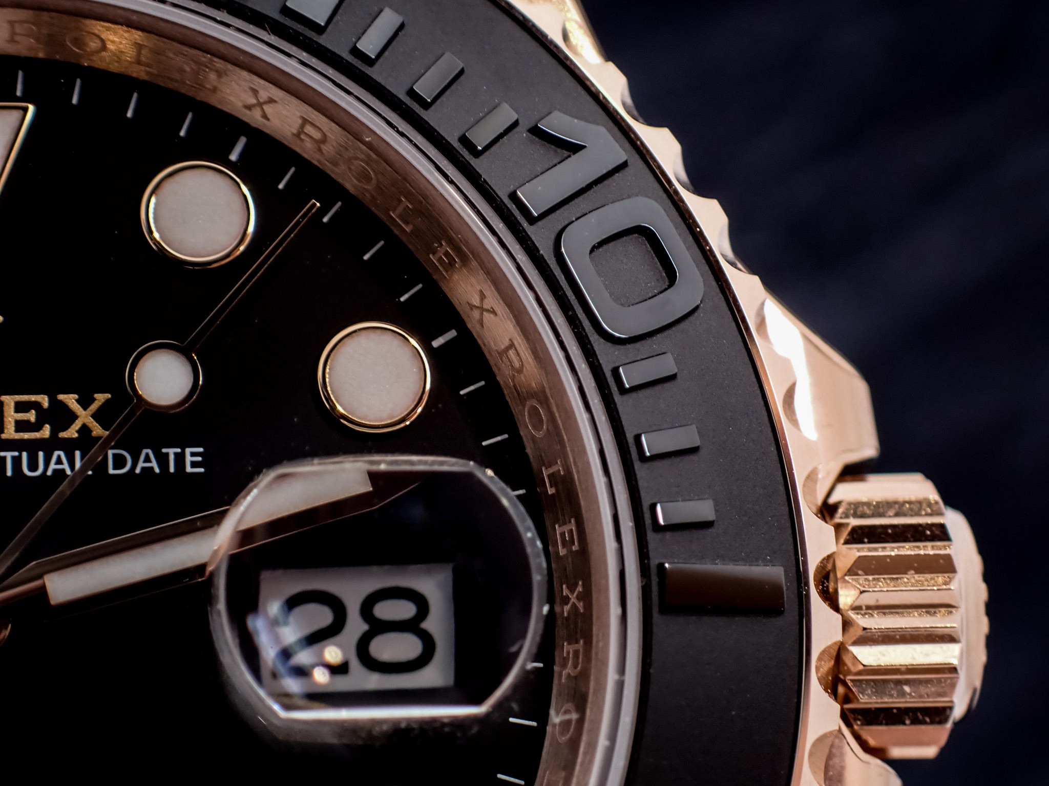 「イエローゴールド(YG)」、「ホワイトゴールド(WG)」、そして今回ご紹介する「エバーローズゴールド(PG)」とありますが、その中でも「YACHT-MASTER」の文字が赤文字で、「ROLEX」の表記がゴールドカラーになっている唯一無二のお時計がこのRef.126655になります。