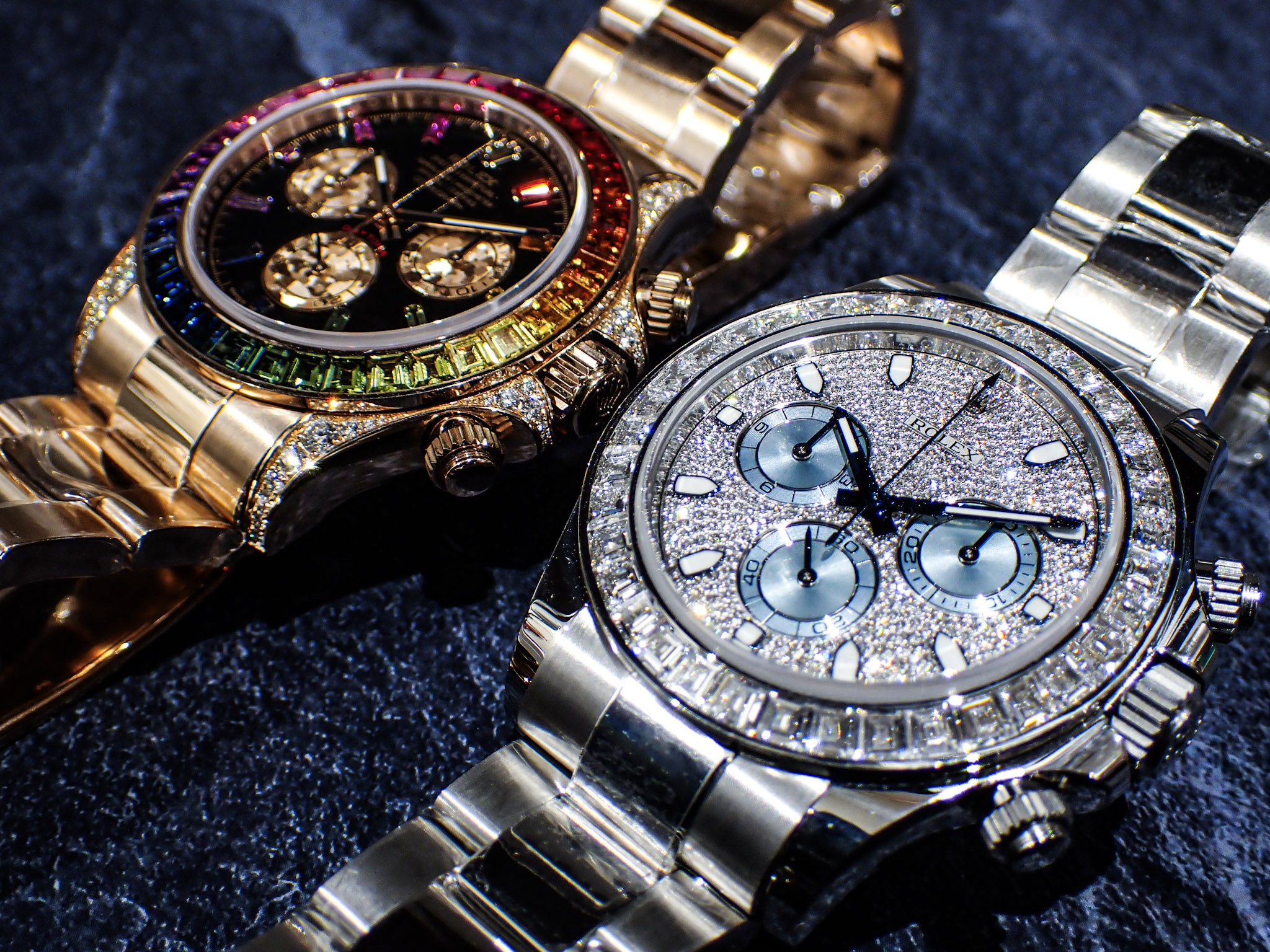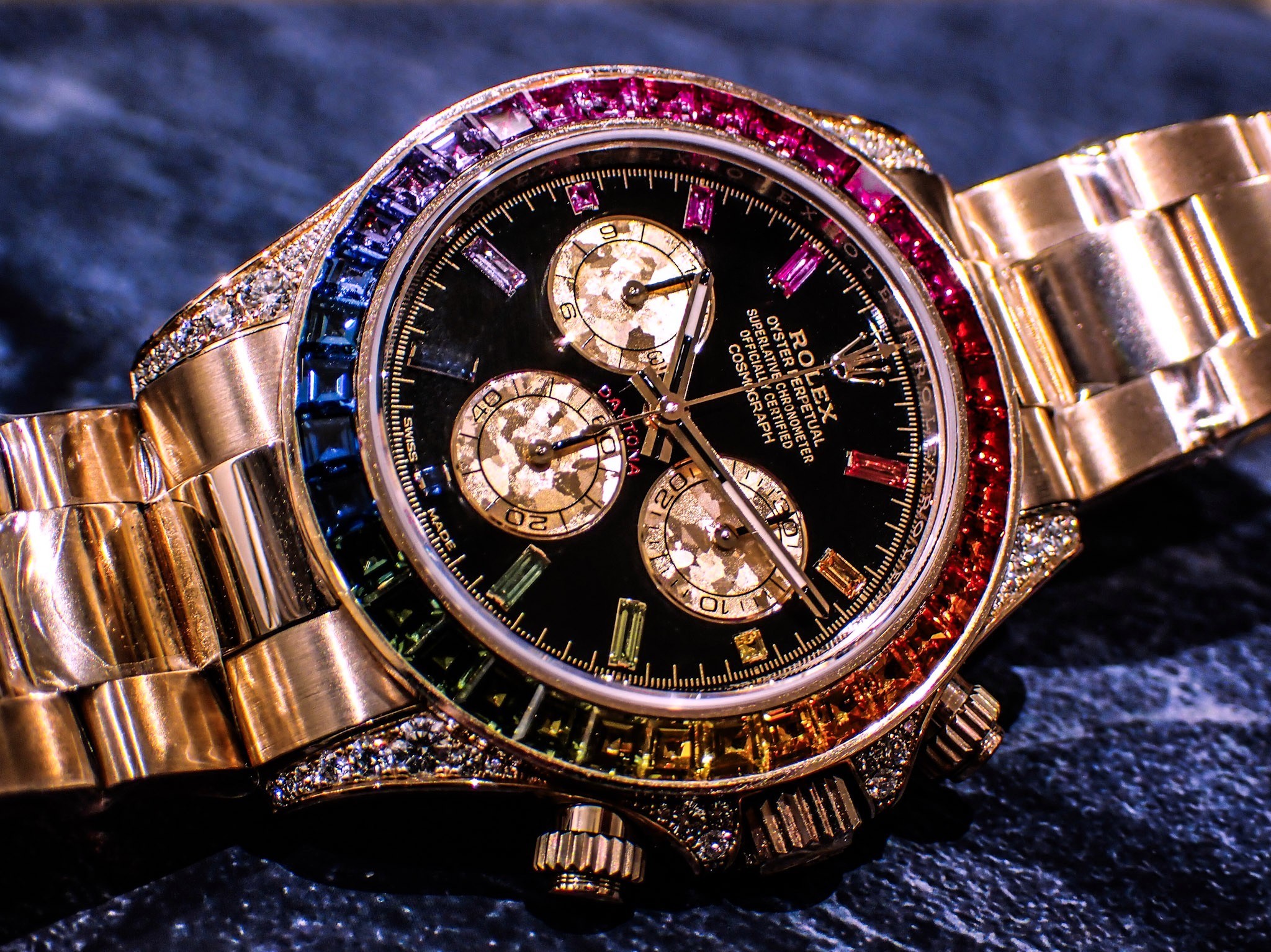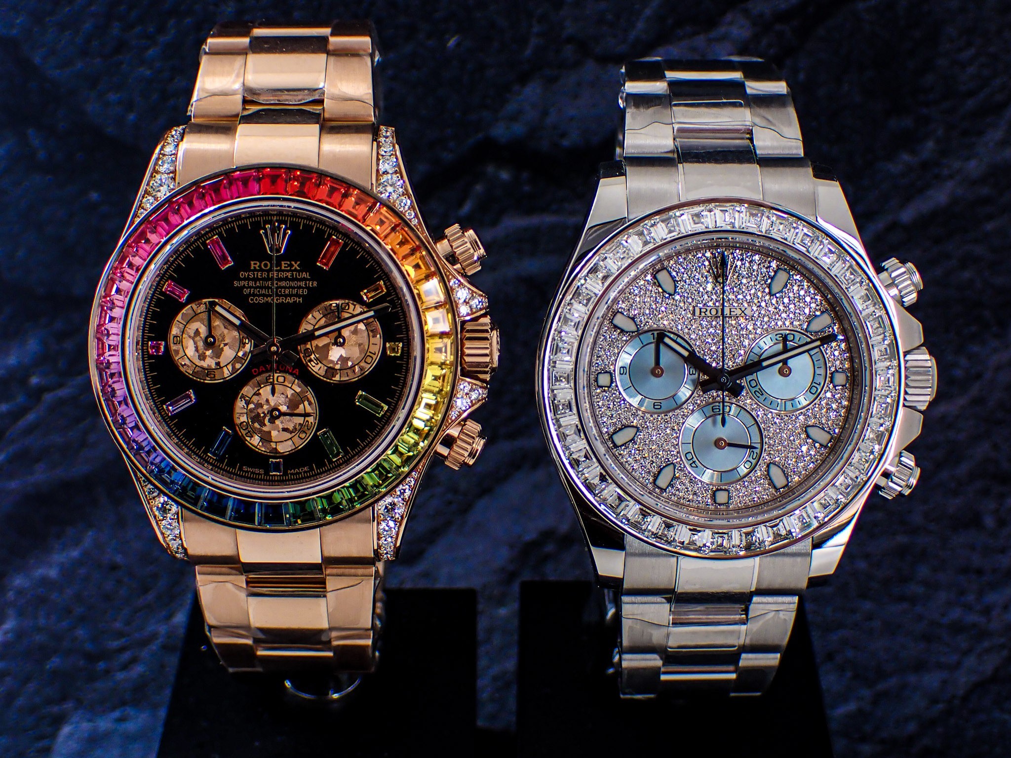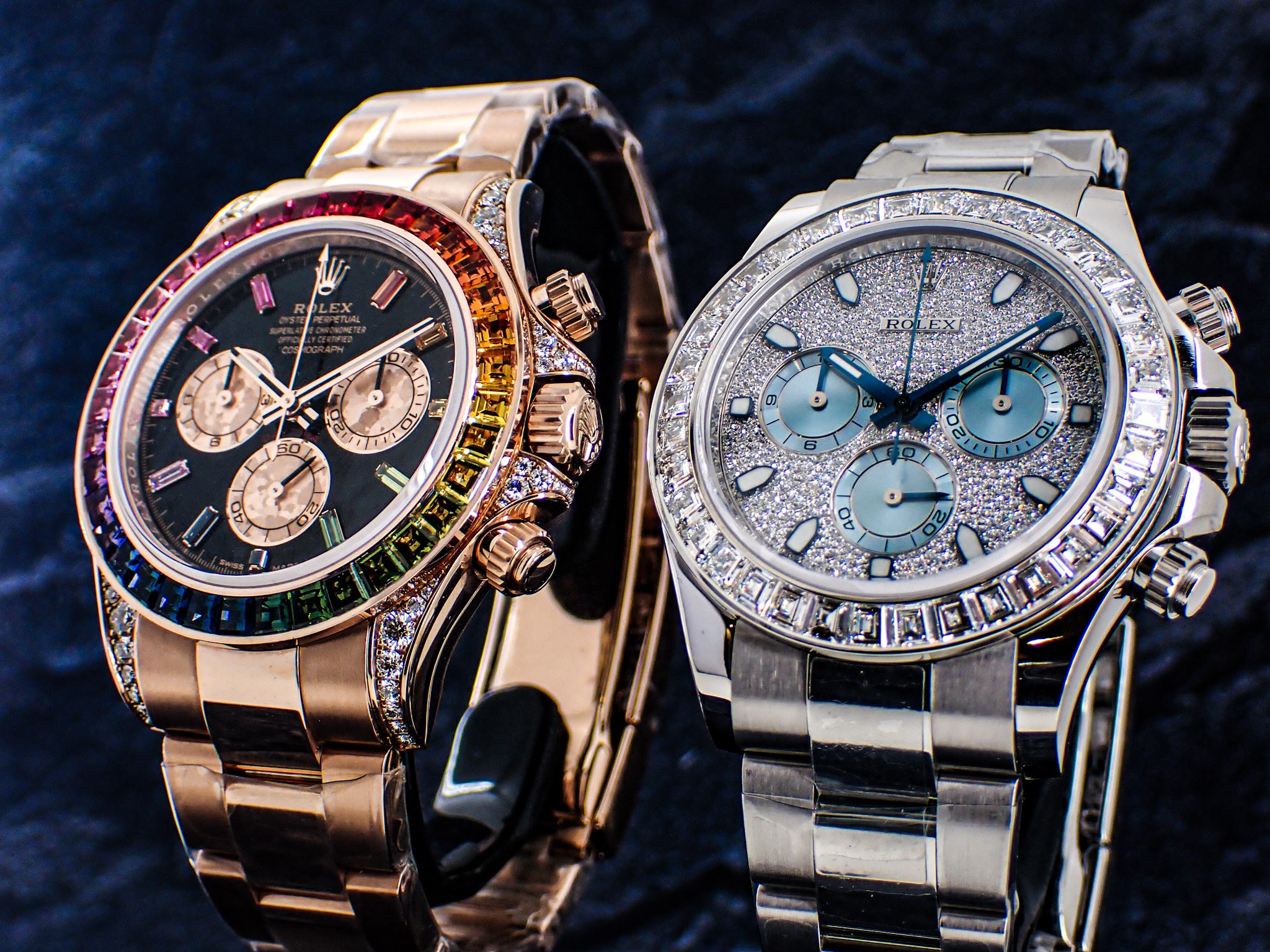 時計自体は、デイトナのエバーローズゴールド(PG)の無垢モデルになるので、落ち着いた色合いで目立ちすぎることもなく、カラーサファイアを支えるベースとして最適だと思います!