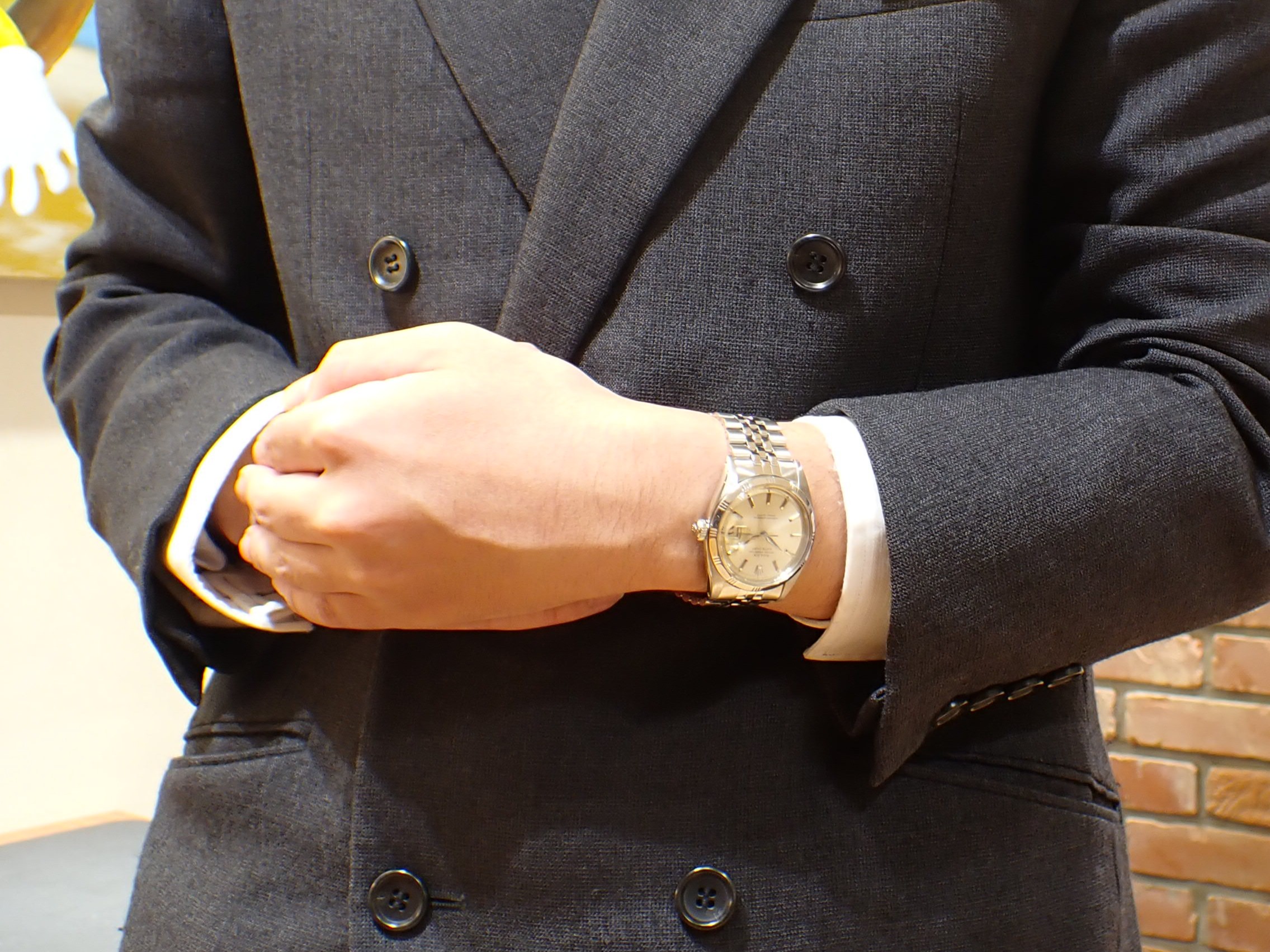 本日はデイトジャスト Ref.1603を紹介いたします。1960年製で登場初期の個体です。市場でよく見かけるRef.1603は、フルーテッドベゼルに似た「エングレーブドベゼル」が備わっていることが多いですが、初期の個体には当商品のような刻みが少ないものがございます。「スリーテッドベゼル」や「バンブーベゼル」とも呼ばれており、市場でも見る機会が少ない大変希少なディティールを兼ね備えております。後年のモデルでは見られないアルファハンド針、デベソバックルに加えて、夜光もラジウムです。ヴィンテージロレックスに精通している方であれば、より魅力的に感じるポイントがたくさんあります。こんなにたくさんの魅力が詰まった個体が、100万円以下でお求めいただける点も素晴らしいです。詳細等気になる方はお気軽にクォーク名古屋駅店までお問い合わせください。