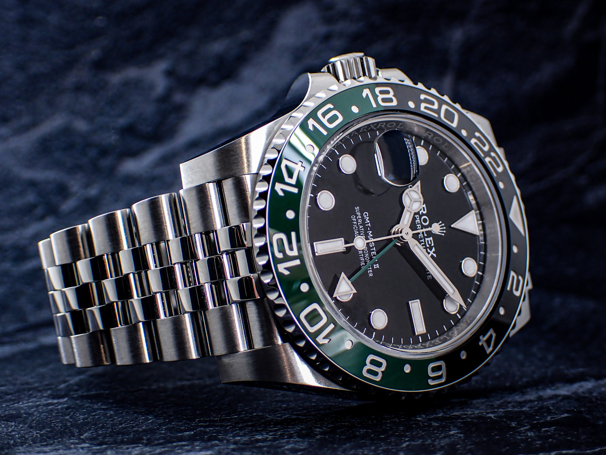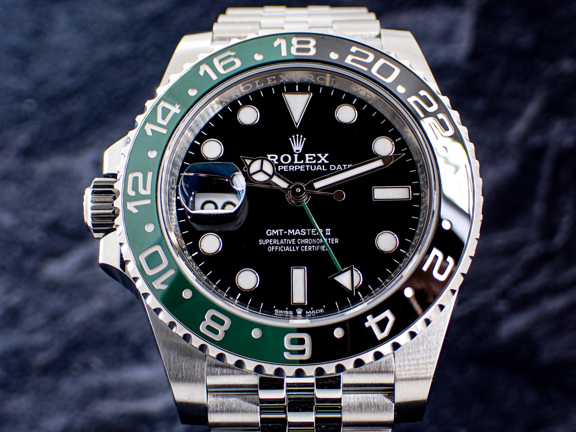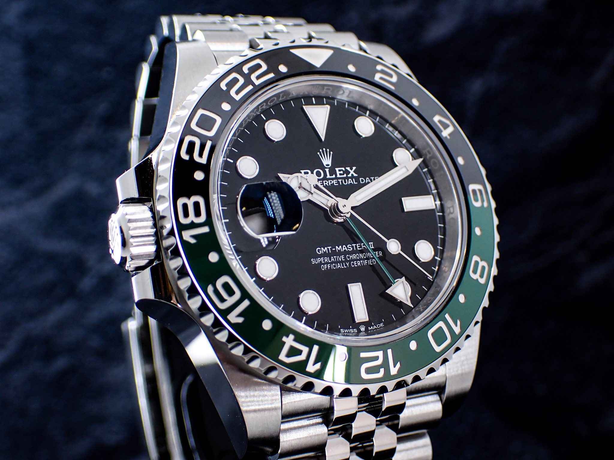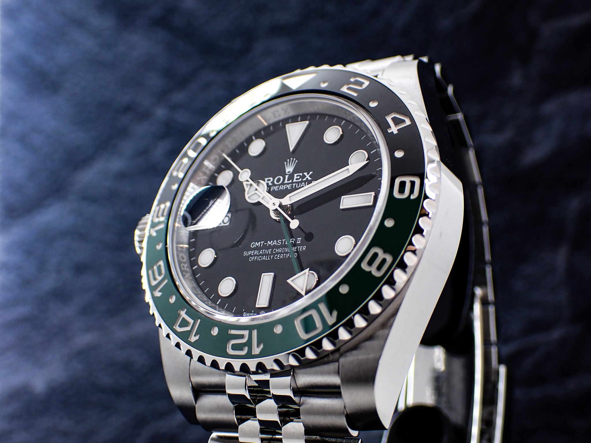 ROLEXのコーポレートカラーでもある「グリーン」がベゼルの下半分と、24時間針に使われており、GMTマスターの中でも一番ロレックス魂を感じられます!