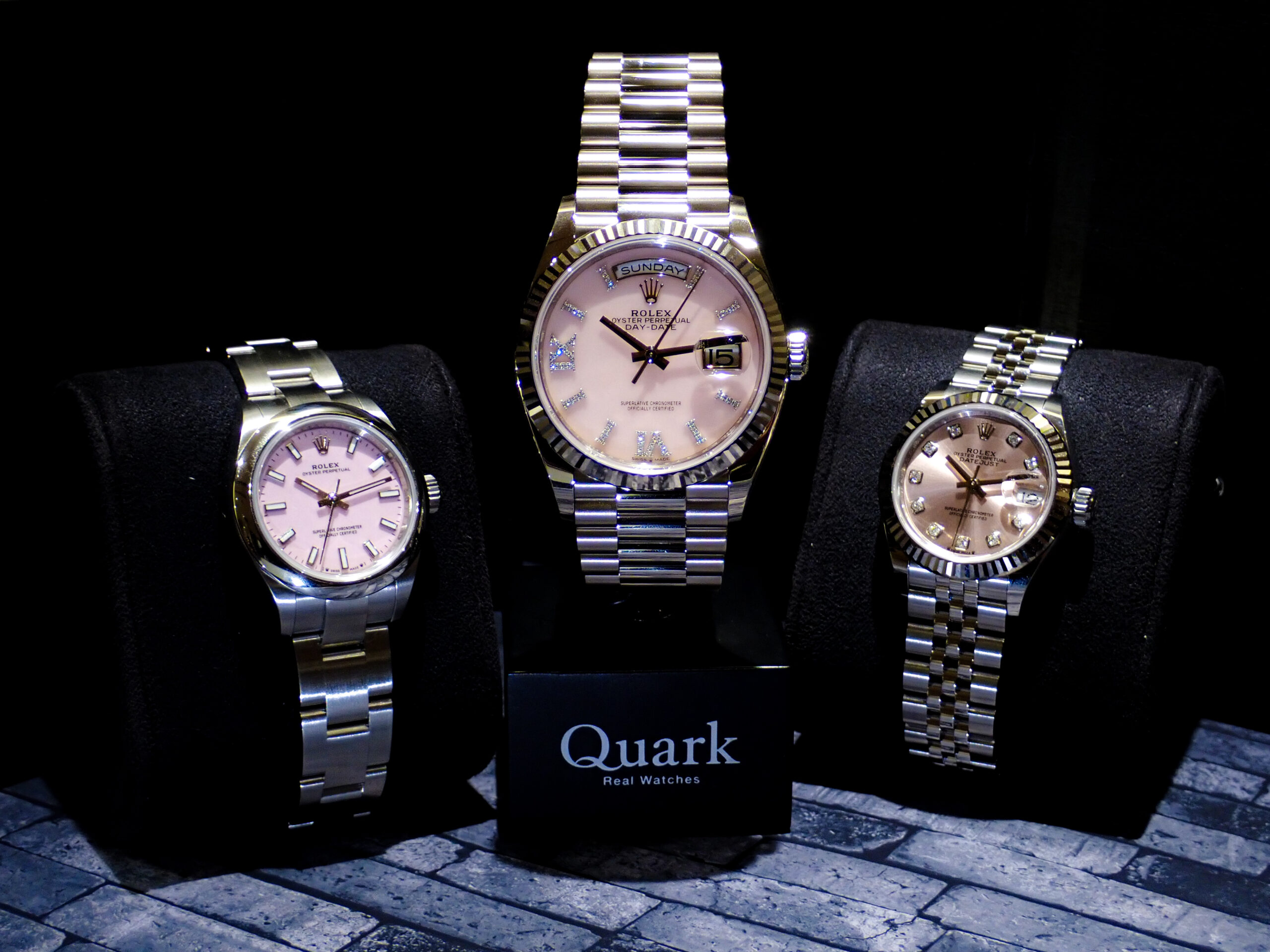 文字盤に装飾石「ピンクオパール」が採用された特別なモデルです。ロレックスの代表的なピンクダイヤルの一つに、オイスターパーペチュアルシリーズの「キャンディーピンク」が挙げられますが、比較するとより柔らかい印象となっております。天然石でありながら、ムラの無い美しい文字盤は、ハイエンドモデルであるデイデイトにぴったりです。伝統的な36mm径という事もあり、男性のみならず、女性でもさりげなくご着用いただけるかと思います。天然石を用いている事もあり、大変希少になっているモデルが、現在名古屋駅店に新品でのご用意がございます。お電話やメールにて【試着予約】も承っておりますので、気になられている方は、是非お気軽にクォーク名古屋駅店までお問い合わせくださいませ。